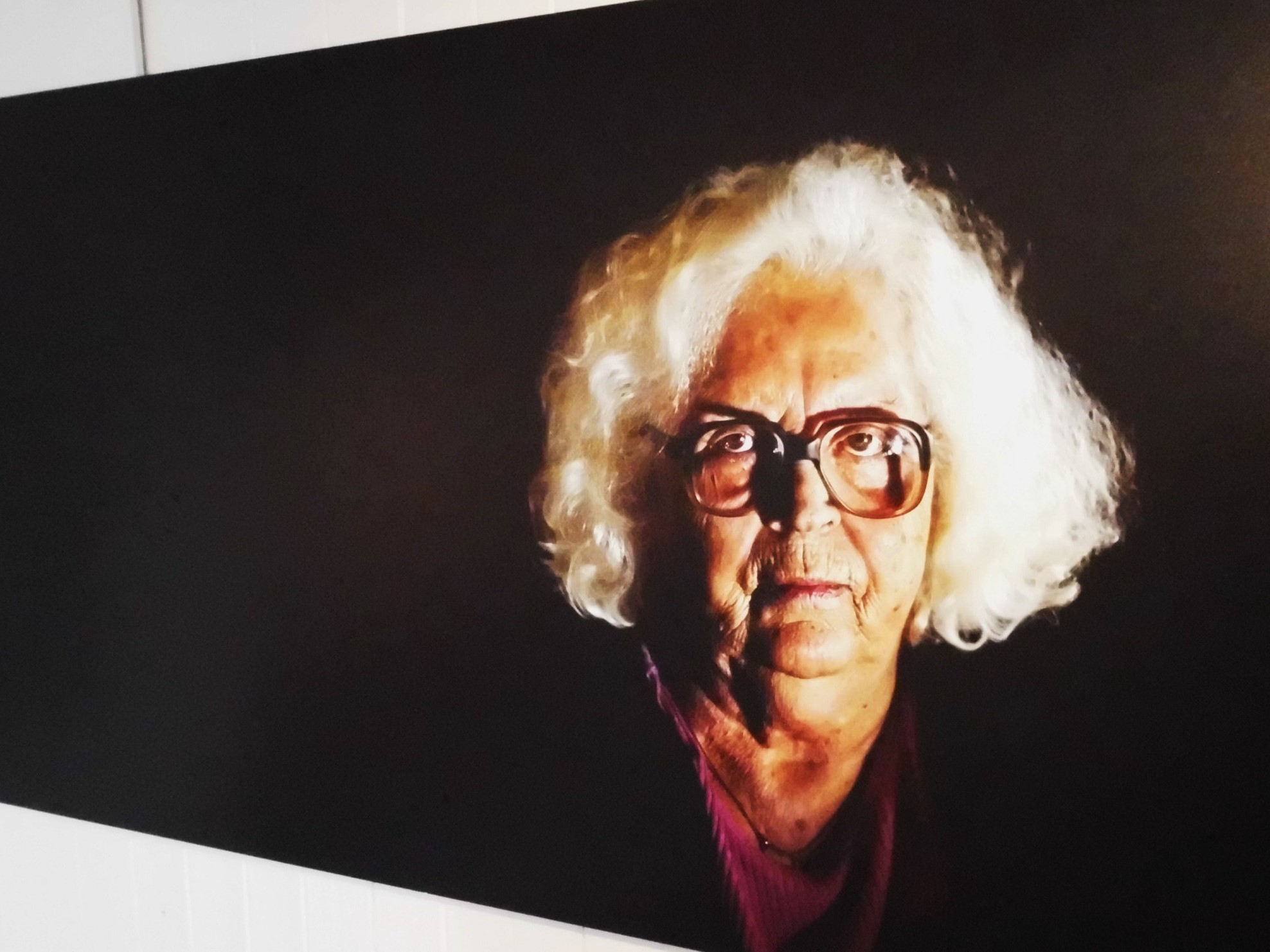 En nu hangt hier haar foto. Het gezicht van een oude vrouw, met strijklicht mooi uitgelicht op een zwarte achtergrond, rechts op een lange horizontale foto. Hij is er bij gaan zitten en kan niets anders dan staren naar dat gezicht.