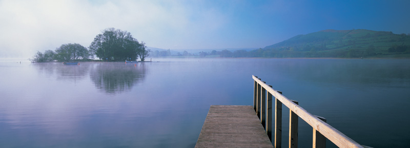 Ik kan steeds verder over het meer kijken. Plotseling doemen uit de nevel twee zwanen op. Zij zwemmen mijn kant op maar als ze mij zien keren ze en argwanend achterom kijkend, verdwijnen ze weer in de mist. De bomen van het kleine eiland in het meer staken de hele tijd al boven de nevel uit. Nu zijn de contouren van het eiland zelf zichtbaar geworden. Rechts van het eiland ligt een bootje met een vissende man. Die heeft daar al die tijd gelegen en ik ben blij dat ik niet hardop in mijzelf praat.