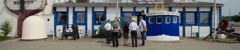 Als je het niet weet is het bijna onvindbaar. Ergens verstopt tussen enorme grauwe loodsen, langs kilometers hekwerk, parkeerterreinen en insteekhavens bevindt zich hier een eetgelegenheid met een uitstekende keuken. Het heet ‘Treff Kaiserhafen’ en volgens een bord wat aan de dakrand hangt is het ‘Die letzte Kneipe vor New York’.
