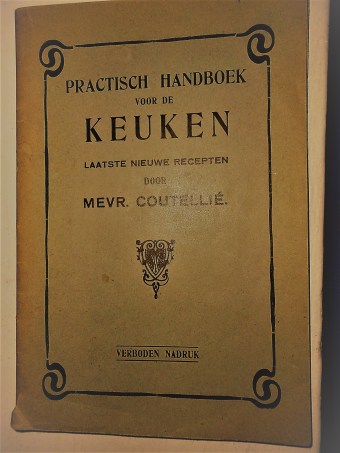 Nu ben ik van plan om een aparte kast te maken voor al die veelbelovende kookboeken. Bij het selecteren kwam ik een boekje tegen wat ik helemaal niet ken. Geen idee waar het vandaan komt, hoe oud het is en wie het uitgegeven heeft. Het lijkt meer een oud schriftje en van de beschreven recepten zijn enkelen zeer summier. Waarschijnlijk werd men geacht over enige basiskennis te beschikken. Nergens wordt gesproken over een koelkast en men hield nog rekening met het seizoen. Zo vermeld het recept voor juliennesoep dat men bij den kruidenier zich een mengsel aan kan schaffen van gedroogde, zeer fijn gehakte groenten. Dit moet in de winter want in de zomer zal men deze soep smakelijker bereiden met versche groenten. Als men dan de groenten noemt die men kan gebruiken, staat daar plotseling ‘latouw’. Nooit van gehoord. Het woord ‘verzijpen’ kom ik ook regelmatig tegen en wat te denken bij de visrecepten van een ‘leevaart’?