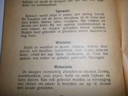 Ik ben dus de woordenboeken ingedoken. Latouw blijkt een soort sla te zijn, verzijpen is uitdruipen of uitlekken en een leevaart is een niet gerookte haring. Voor een Hollander als ondergetekende zijn dit onbekende woorden maar blijkbaar niet voor onze Vlaamse vrienden. Zo staan er meer woorden in die duiden op een Vlaamse herkomst van dit boekje en dat maakt het leuk. Natuurlijk had de ‘onhollandse’ naam van de schrijfster al een vermoeden kunnen geven. Dat uien ajuinen zijn, samoule griesmeel is en dat biersoep met eieren een godenmaal mag heten is hen natuurlijk met de paplepel ingegeven.