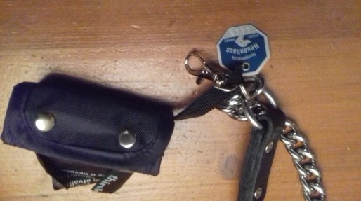 ‘Oke, dan heb ik mazzel. Heeft u nog een houdertje voor die penning of hoeft dat niet als een kentekenplaat op de achterkant van de hond te zitten?’