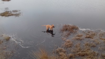 Een doorbraak! Zijn trutje is iets minder truttig geworden. Tot nu toe was een plasje water iets waar je omheen loopt en de waterkant niets minder dan de grens tussen leven en dood. Was de gang door een plas onvermijdelijk dan werden de broekspijpen hoog opgetrokken en de doortocht door de dode zee met grote angst genomen. Afgelopen maandag, tijdens een wandeling over de dijkjes van het afgegraven hoogveengebied, lag er iets in het water wat zo interessant was dat het de angst te boven ging. Heel, heel voorzichtig werden de eerste stapjes in het water gezet. Niet te ver want het moet natuurlijk wel leuk blijven. Gisteren was hij daar weer en nu durfde ze tot haar buik. Dat voelt zeker koud en dus eng. Verder ging ze niet. Ze was net zo uitgelaten als hij toen ze er uit kwam. Zag je wat ik al durf!?