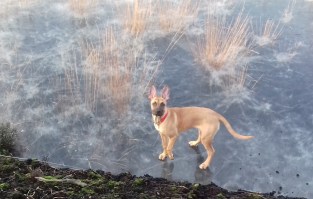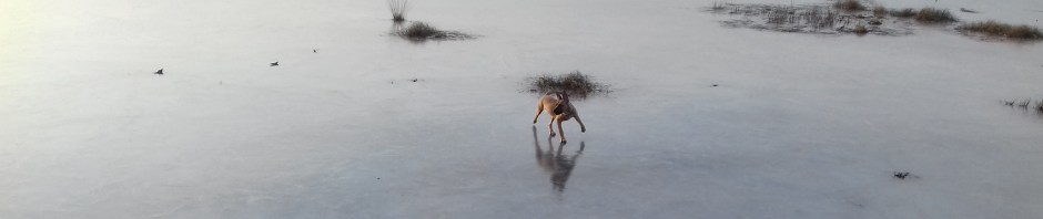 De vorst heeft ook toegeslagen in het hoogveengebied. Bevroren plassen met schaatsende kinderen en een vaste ondergrond waar je, zonder kans om er in weg te zakken, gewoon kan lopen. Voor de hond een nieuwe ervaring. Het ging niet zonder slag of stoot. Enige overredingskracht en een stuk weggeworpen hout trokken haar uiteindelijk over de streep die tussen land en bevroren water ligt.