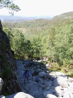 Boven aan het hele steile stuk wat ook nog akelig smal is, zit zoonlief met een glimlach op zijn oude vader te wachten. Ja ja, ik weet het. Dit moet je toch eenmaal in je leven gedaan hebben en we zijn er nu bijna en het is toch een schitterende belevenis en wat een mooie, ruige omgeving en die Noren, die boffen maar met zo’n land. Peptalk. Wat lief! Ja joh, loop maar wat vooruit. Ik zie je vanzelf wel weer. Verdwalen kan je hier niet toch?