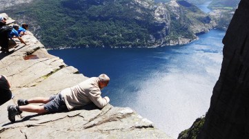 Ik moet aan hem denken als ik met zoonlief op vakantie ben in Noorwegen. Ik denk dat ik in een vlaag van verstandsverbijstering maar het kan ook een geval van misplaatste overmoed of een categorische ontkenning van klimmende jaren zijn, instem met de beklimming van de Preikestolen. In goed Hollands de Preekstoel. Het is een vlakke, ver uitstekende rots, loodrecht 600 meter boven het water van de Lysefjord.